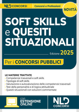 Il Volume Soft skills e quesiti situazionali per i concorsi pubblici, NLD Concorsi 2025, supporta chi si prepara ad affrontare le prove concorsuali che includono la valutazione delle abilità personali e relazionali (c.d. soft skills), sempre più centrali nei percorsi di selezione. Oltre alla preparazione tecnica sulle materie previste per ciascun profilo, i candidati devono dimostrare di possedere doti come la gestione efficace delle relazioni interpersonali, la capacità di affrontare situazioni complesse o stressanti, la propensione al lavoro in gruppo e l'inclinazione al coordinamento e alla guida. Queste caratteristiche vengono spesso indagate tramite test attitudinali e, in particolare, quesiti situazionali, che richiedono non solo intuito, ma anche l'applicazione di strategie ben definite per essere affrontati con successo. Il volume è così strutturato: Parte I (Competenze trasversali e soft skills), recante la classificazione e il quadro delle competenze; Parte II (Tipologie di soft skills), contenente una ricognizione delle principali tipologie di competenze trasversali; Parte III (Valutazione e autovalutazione delle competenze trasversali), che si sofferma su gli strumenti di valutazione e autovalutazione delle soft skills rivolgendosi a studenti e dirigenti pubblici e offre modelli esemplificativi dei test situazionali somministrati nei principali concorsi pubblici. La parte contiene, inoltre, un approfondimento sui test della personalità, i quiz di logica attitudinale e il colloquio; Parte IV (Quesiti situazionali), che offre batterie di quesiti situazionali con soluzioni commentate. Il Manuale permette, infine, l'accesso ad una estensione online, consultabile con apposita password, per rimanere aggiornati sulle materie oggetto d'esame.