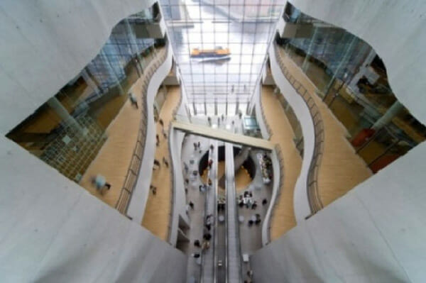 Al centro dell’edificio, un enorme atrio di 8 piani che funge da ingresso e da lucernario, permettendo alla luce di invadere l’ampio spazio interno che è completamente bianco. I piani hanno dei balconi che formano onde che si incontrano in ogni lato dello spazio: queste, per permettere l’accesso a tutte le parti dell’edificio, sono state collegate da scale mobili e da ponti che attraversano lo spazio in più punti.