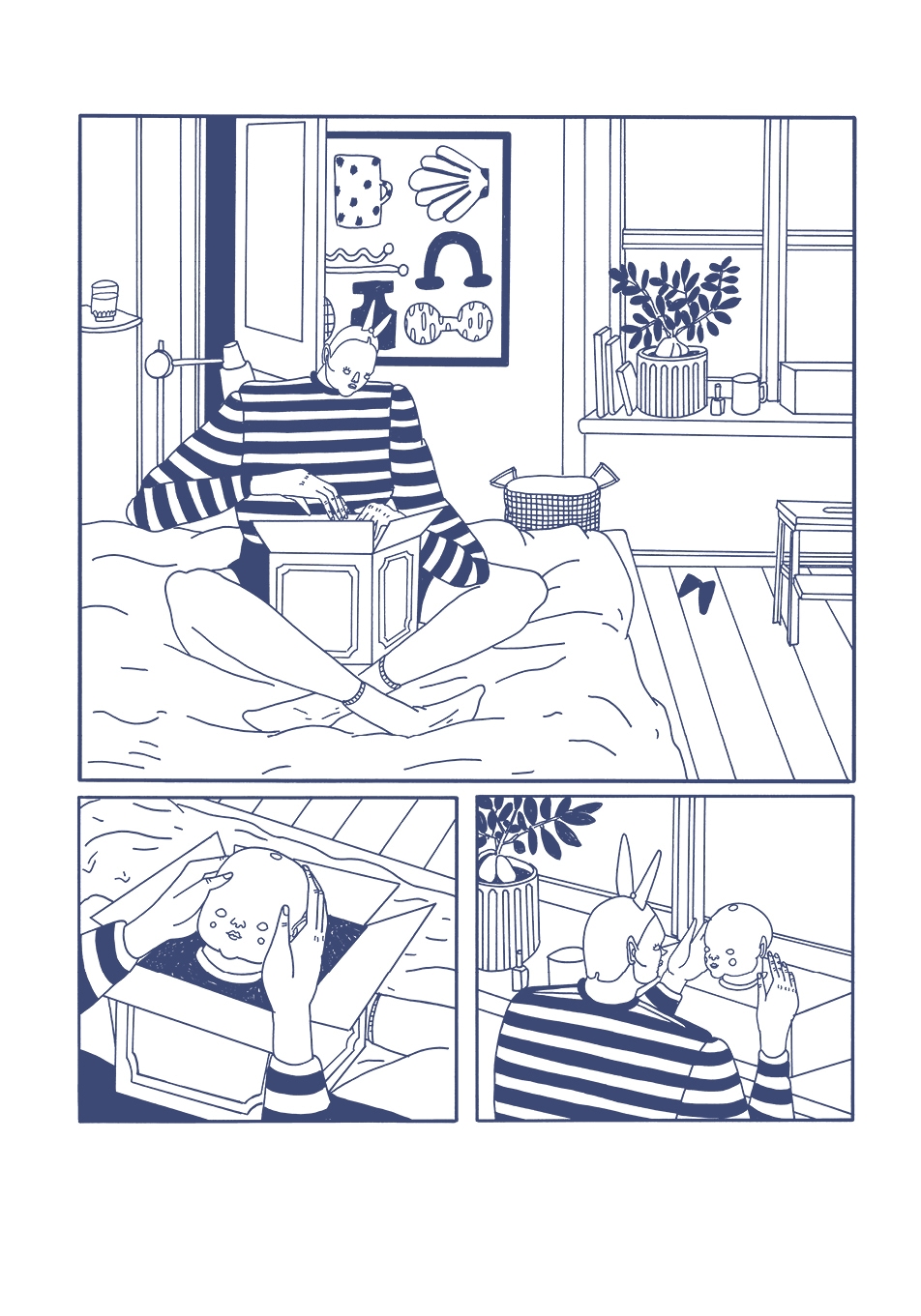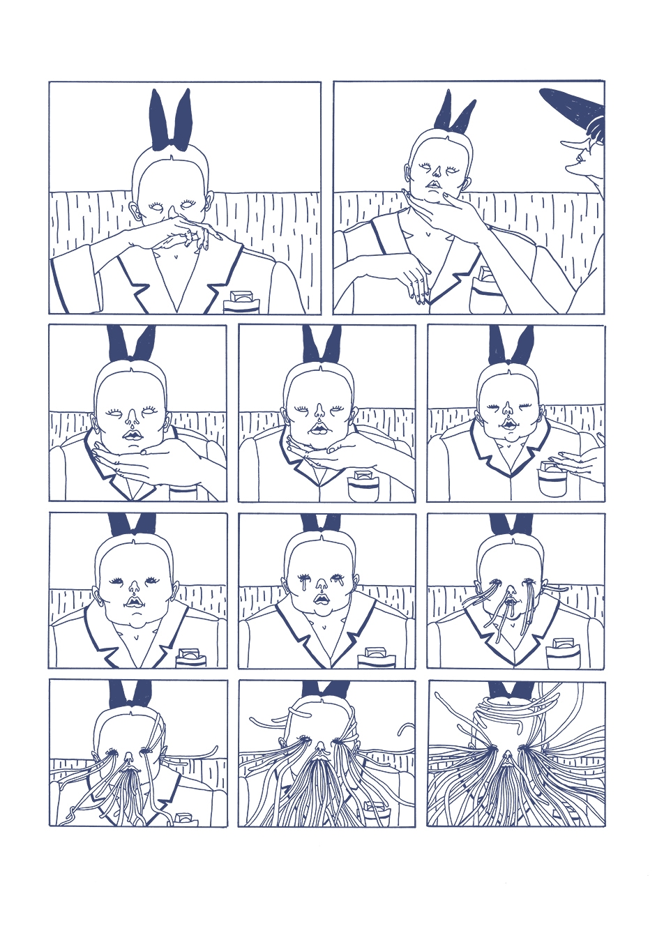 Per dare forma al suo racconto distopico – un po’ orwelliano e certamente in dialogo con Maus, la graphic novel pluripremiata di Art Spiegelman – Bim Eriksson sceglie uno stile grottesco: corpi imponenti, volti senza espressione, maschere che nascondono le reali identità. Non è la bellezza che cerca Eriksson ma, al contrario, sono il disagio e la scomodità. La mano dell’autrice è mossa dal bisogno di far percepire a chi legge tutta l’angoscia di un mondo in cui non si possa piangere, dire “sto male”, affermare la propria fragilità.