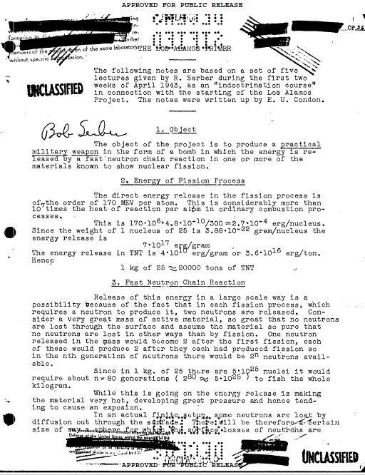 Appunti delle lezioni tenute da Robert Serber a Los Alamos all’inizio del Progetto Manhattan sul cammino da intraprendere per ottenere la bomba. Nel punto 1 si legge: “Lo scopo del progetto è produrre una pratica arma militare, in forma di bomba, nella quale l’energia venga rilasciata da una veloce reazione a catena in uno o più dei materiali che sappiamo sviluppare la fissione nucleare”