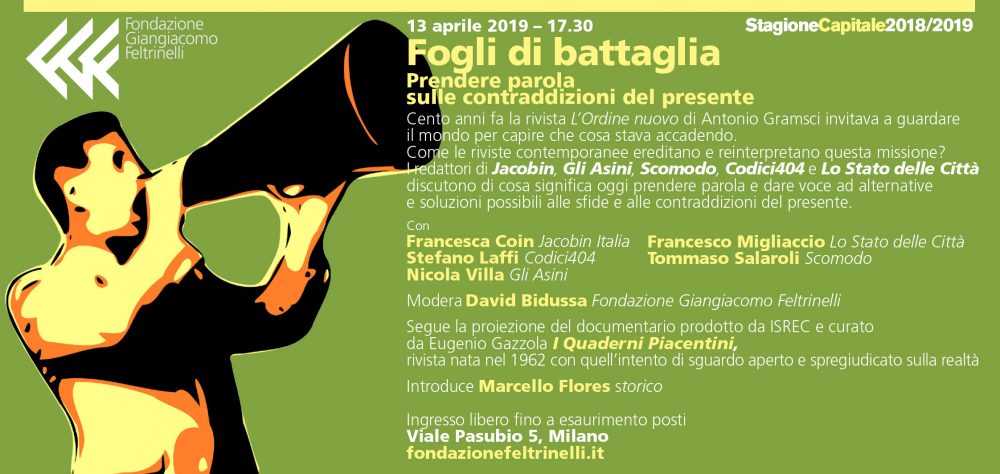 Ormai però è tempo di bilanci: sabato 13 aprile, la Fondazione Feltrinelli dedicherà un appuntamento alle riviste politiche e culturali, ai Quaderni e i suoi simili e a chi usa “l’indagine, lo sguardo critico, il confronto aperto per portare a emersione rimossi, per dare parola a soggetti esclusi, per proporre interpretazioni e immaginari alternativi a quelli egemoni.”
