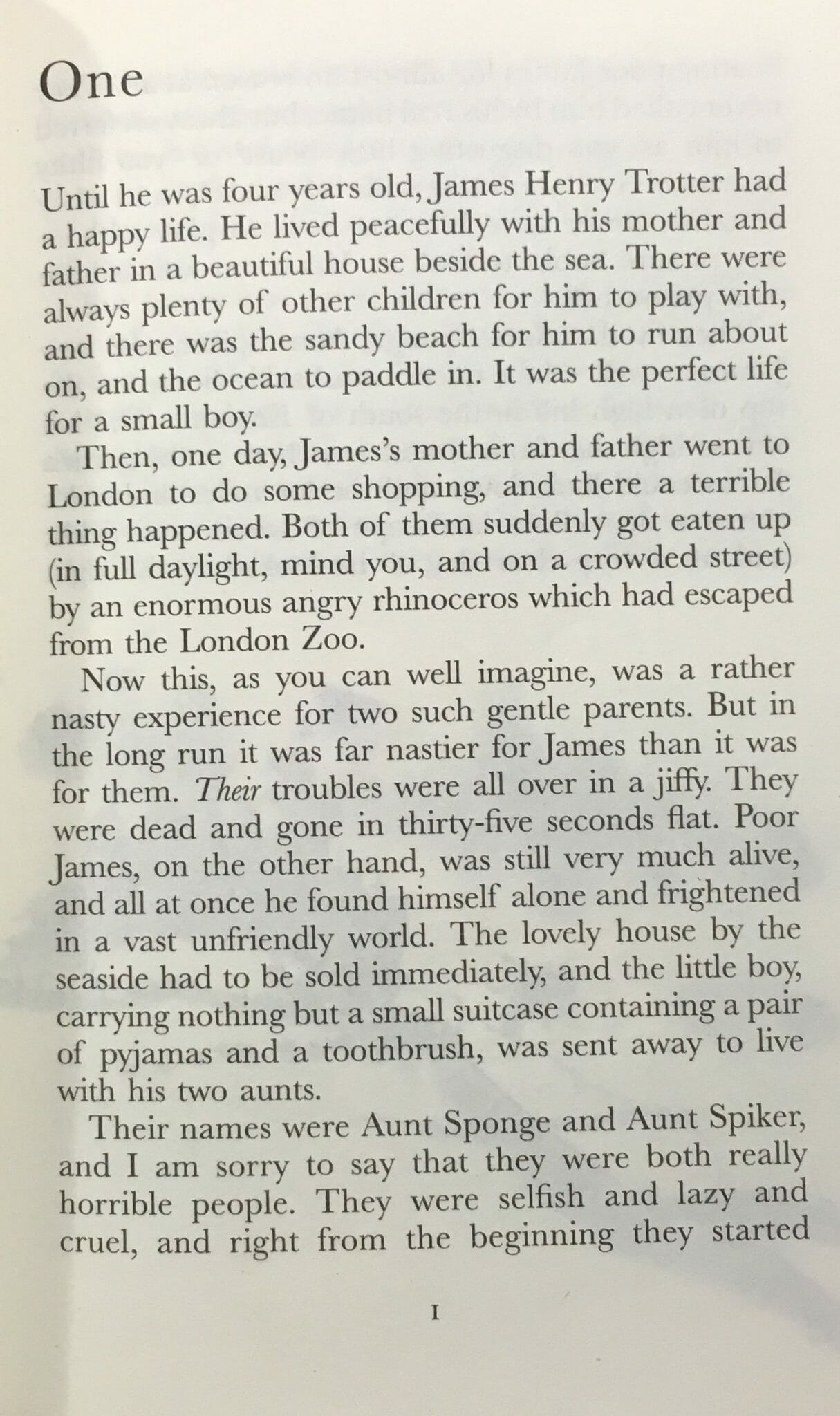 E osservate: sulla sinistra, tutto solo, c’è James. Questa è la mossa più interessante di Simeon. Lui mette James a Londra, sulla scena dell’incidente. Dahl no. Il testo non preclude la possibilità che James abbia accompagnato i suoi genitori in città , ma nemmeno è esplicito in proposito. Simeon trasforma James in un testimone oculare. Distoglie lo sguardo dalla carneficina, fissando lo spazio bianco del margine sinistro, verso le pagine introduttive del libro, prima che la storia cominci. James vorrebbe tornare indietro, a quando era felice e i suoi genitori erano ancora vivi. Ma la storia va avanti, verso destra, oltre il rinoceronte, verso la vita miserabile con le orribili zie, che comincia proprio alla pagina successiva.