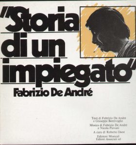 Arriviamo ora a ‘Storia di un impiegato‘, il terzo concept album dell’autore, che possiamo definire il più ‘politicheggiante’, caratterizzato da un linguaggio oscuro ed ermetico, troppo anche per lo stesso De André. Si parte dalla Canzone del maggio, liberamente ispirata alla canzone di Dominique Grange Chacun de vous est concerné, fa da introduzione a un album che descrive come la vita dell’impiegato continui, dai primi moti alla prigione. Al ballo mascherato partecipano tutte le figure autoritarie sotto cui l’impiegato deve stare, nomina il Cristo, la Madonna, l’ammiraglio Nelson e perfino Dante. Il bombarolo, terrorista per cui la fine di un amore è cosa ben più problematica da gestire rispetto al tentativo di far esplodere il Parlamento, riprende di nuovo Brassens, in particolare la Trompettes de la renommée. Nella mia ora di libertà deve molto, come in effetti l’intero album, a La centrale idroelettrica di Bratsk scritto da Evgenij A. Evtušenko. Fino all’ultimo brano dell’album, dichiarazione d’amore finito e sanguinante, di Verranno a chiederti del nostro amore, la cui struttura è facilmente riscontrabile nella canzone d’amore classica.