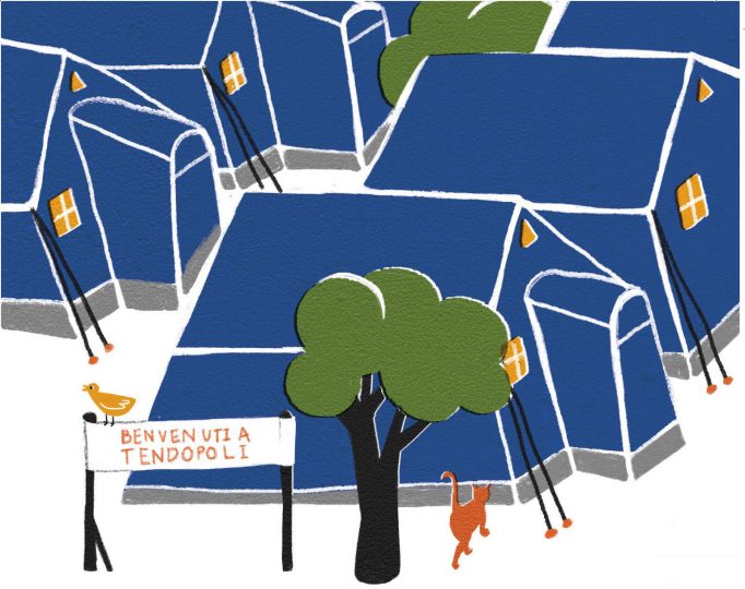 Oscar, il protagonista di Casca il mondo, ha un’ossessione molto concreta, come tutti i bambini: vuole tornare a casa. Sì, c’è stato il terremoto, i genitori sono stravolti e lui stesso ha subito un trauma, perché ha perso le parole. Ma non è quello il punto, il punto è che a Tendopoli manca il suo coccodrillo portasapone, manca la vita di prima.