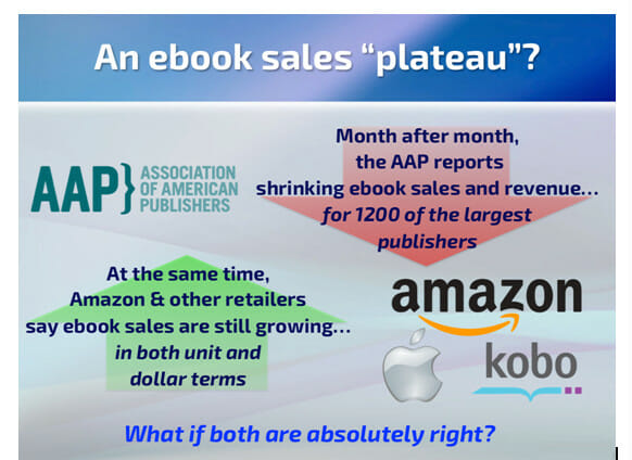Di quale conclusione si tratta? Data Guy parte da una constatazione: da un lato, i grandi editori rilevano una diminuzione delle vendite di e-book; dall’altro, i negozi on-line continuano a parlare di vendite in aumento. Ebbene, a suo avviso tutti e due i soggetti hanno ragione: è vero che i grandi editori vedono diminuire le vendite di e-book, ma questo succede in primo luogo perché la loro quota di mercato sta a sua volta scendendo a favore dei cosiddetti autori ‘indie’ e del self-publishing. I dati complessivi mostrano effettivamente un rallentamento della crescita (che Data Guy chiama ‘plateau’ e che io ho altrove chiamato ‘scalino’), ma non un suo arresto completo: piuttosto, si assiste a un forte rimescolamento interno dell’equilibrio fra quota del mercato digitale appannaggio dei grandi editori e quota legata ad autori indipendenti e self-publishing.