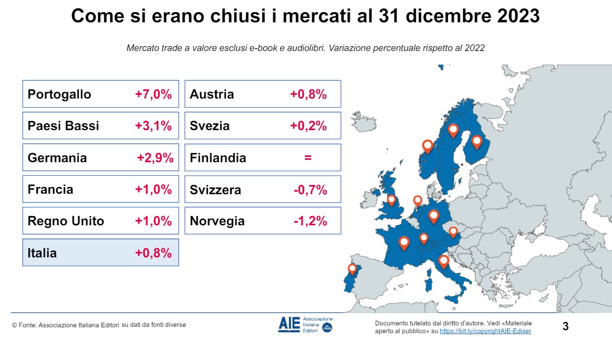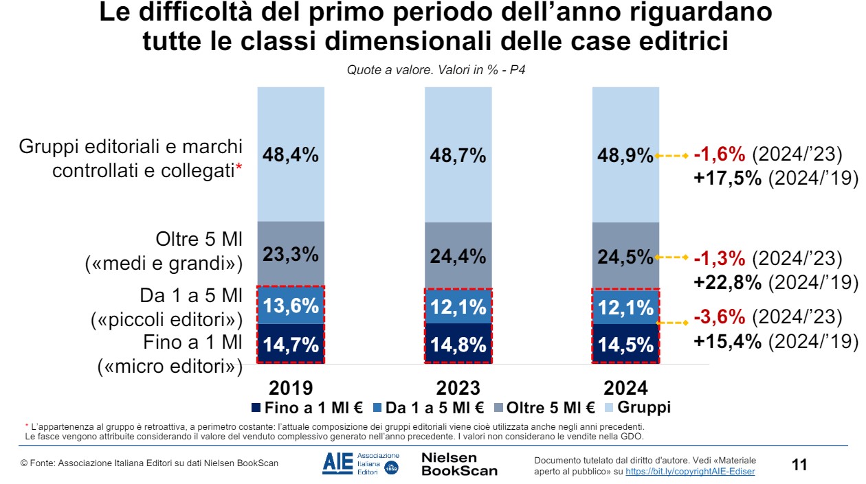 L’analisi e rielaborazione dell’ufficio studi AIE sulla base di dati Nielsen BookScan e altre fonti è stata presentata al Salone Internazionale del Libro di Torino nel convegno Il mercato del libro nei primi mesi del 2024, in collaborazione con Aldus Up, il programma europeo finanziato dalla Commissione Ue tramite Europa Creativa.