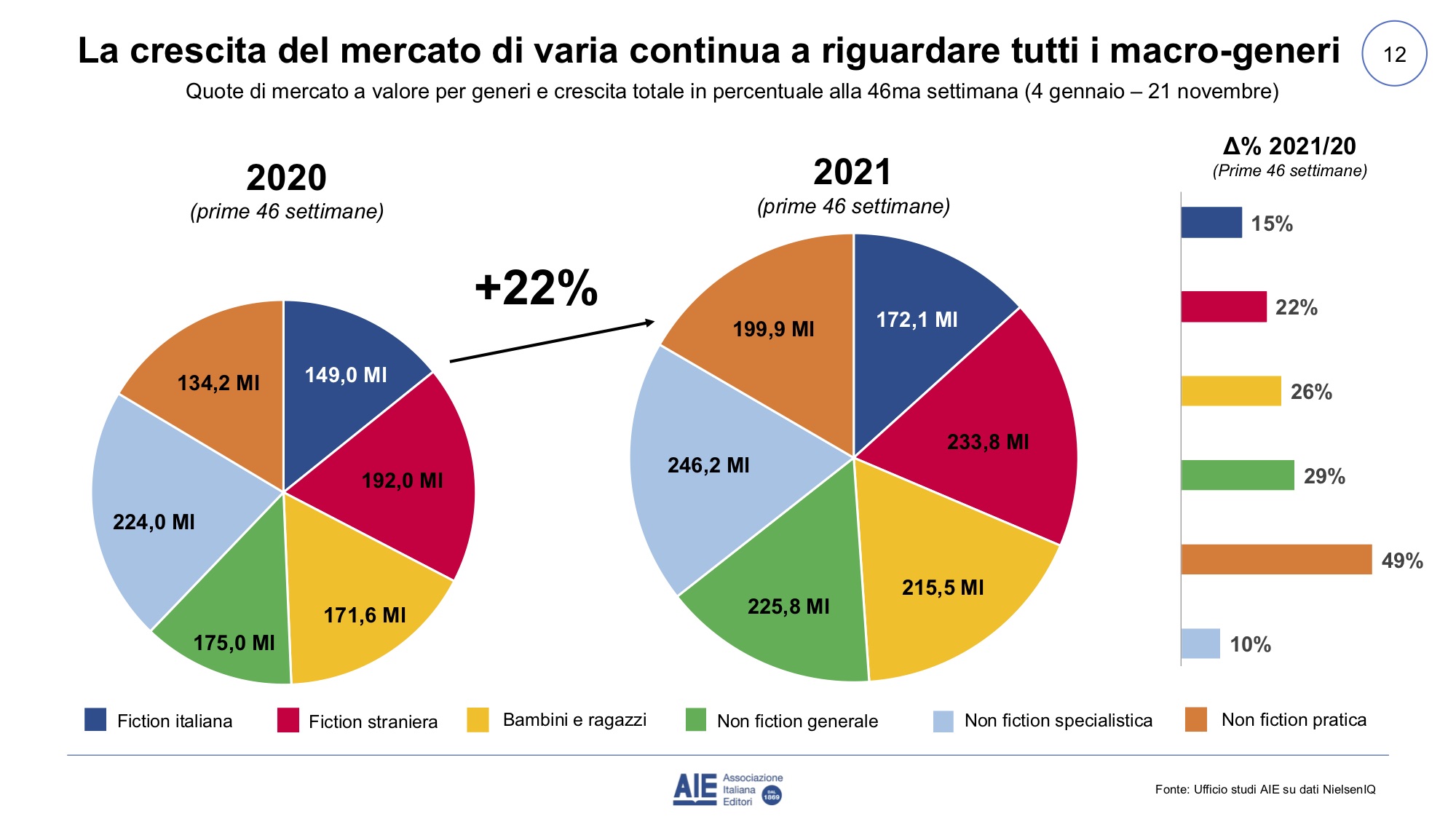 Nel periodo 4 gennaio-11 novembre 2021 le vendite a prezzo di copertina sono state pari a 1.356 milioni di euro, in crescita del 22% rispetto al 2020 e del 15% rispetto al 2019. A volume, si tratta di 92 milioni di libri, in crescita del 25% rispetto al 2020 e del 17% rispetto al 2019. Il prezzo di copertina del venduto, infatti, è pari a 14,67 euro, in calo del 2,4% rispetto al 2020 e dell’1,7% rispetto al 2019.