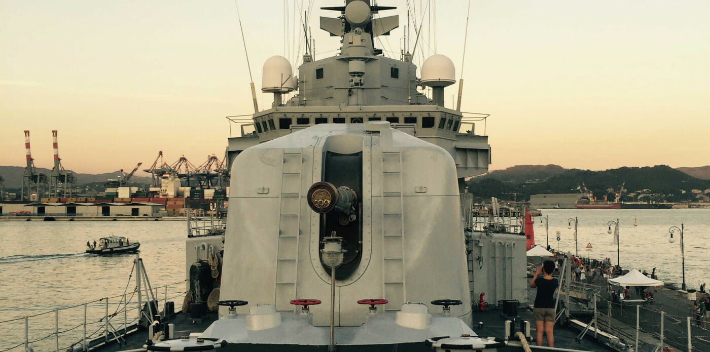Il comandante mi ha offerto di visitare la nave affidandomi a un giovane tenente di vascello, Giuseppe Bisceglia. La Scirocco è una delle navi più impiegate nelle missioni reali: Golfo1, Golfo2, Libia più volte, Mare Nostrum, Somalia e Corno d’Africa… Missioni anti pirateria, terrorismo, traffici umani a salvaguardia della vita più che a toglierle. Tutti temi del Segno dell’aquila. Mi ha ricordato anche Il Leone d’oro, di Wilbur Smith, grazie al quale ho solcato lo stesso mare trecento anni fa, già allora pattugliato dalla Marina Inglese contro i pirati. La descrizione di una gigantesca mitragliera che spara 800 proietti al secondo calcolando la rotta di intercettazione del nemico, il vento, la velocità della nave e l’umidità dell’aria già mi ha riportato al capolavoro di Claudio Magris e all’effetto realtà che la descrizione puntigliosa delle armi mi ha suscitato. È un libro che resta. Il tenente di vascello ha tenuto a precisare che le armi su quella nave sono impostate prioritariamente per la difesa e la protezione. Siamo in Europa, una bolla spazio temporale vasta come un continente e lunga 70 anni di pace, un fatto atipico nella Storia. Ma bisogna ricordare la guerra per mantenere la pace e bisogna anche difenderla con navi come la Scirocco. Anche la pace ha bisogno di soldati e proteggere, come già diceva Machiavelli, è più difficile che offendere.