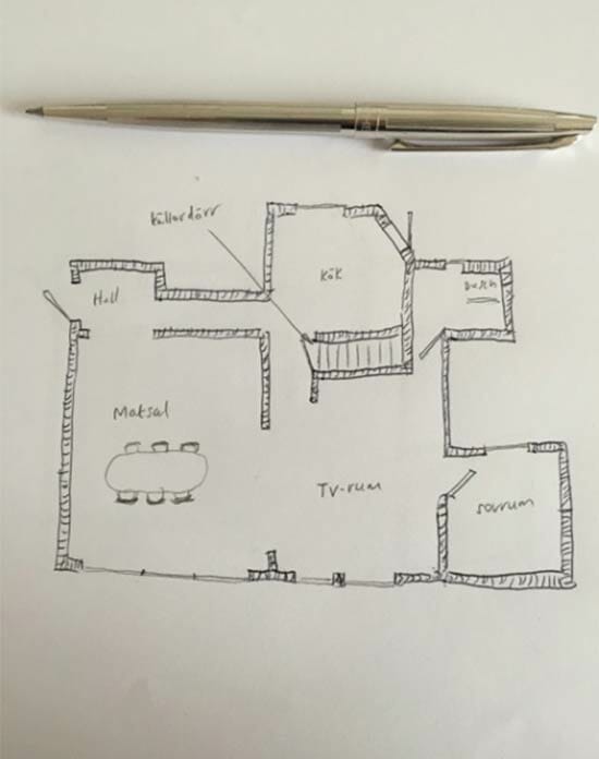 Per un ulteriore controllo abbiamo deciso di scrivere agli autori (se non lo sapete: dietro lo pseudonimo di Lars Kepler si celano marito e moglie, Alexander e Alexandra Ahndoril)… Ecco la loro risposta, e la migliore dimostrazione della precisione con cui Lars Kepler lavorano. Ed ecco anche la risposta alla domanda iniziale: come nasce una scena del delitto nella mente dello scrittore di thriller? Con una mappa… in svedese!