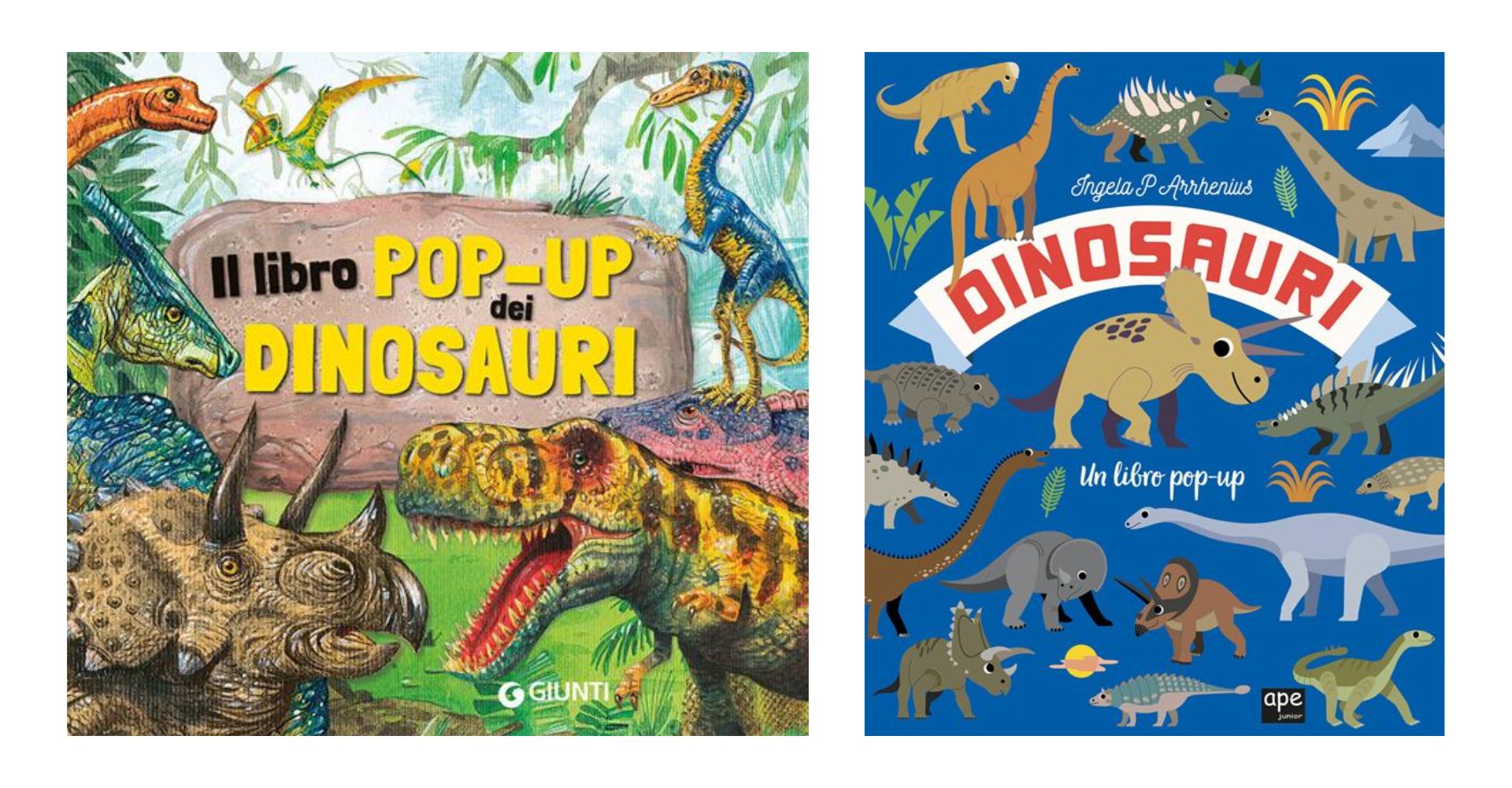 Per gli appassionati di dinosauri, sono molte le proposte di libri animati. Qui presentiamo Il libro pop-up dei dinosauri di Francesca Pellegrino (Giunti, illustrazioni di Matteo Lupatelli) e Dinosauri – un libro pop-up di Ingela P. Arrhenius (Ape Junior), opere arricchite di elementi tridimensionali e di alette da sollevare per imparare a conoscere tutte le specie di rettili preistorici. Il primo libro è consigliato ai lettori dai 7 anni di età, il secondo invece è dedicato ai bambini e alle bambine dai 3 anni in poi.