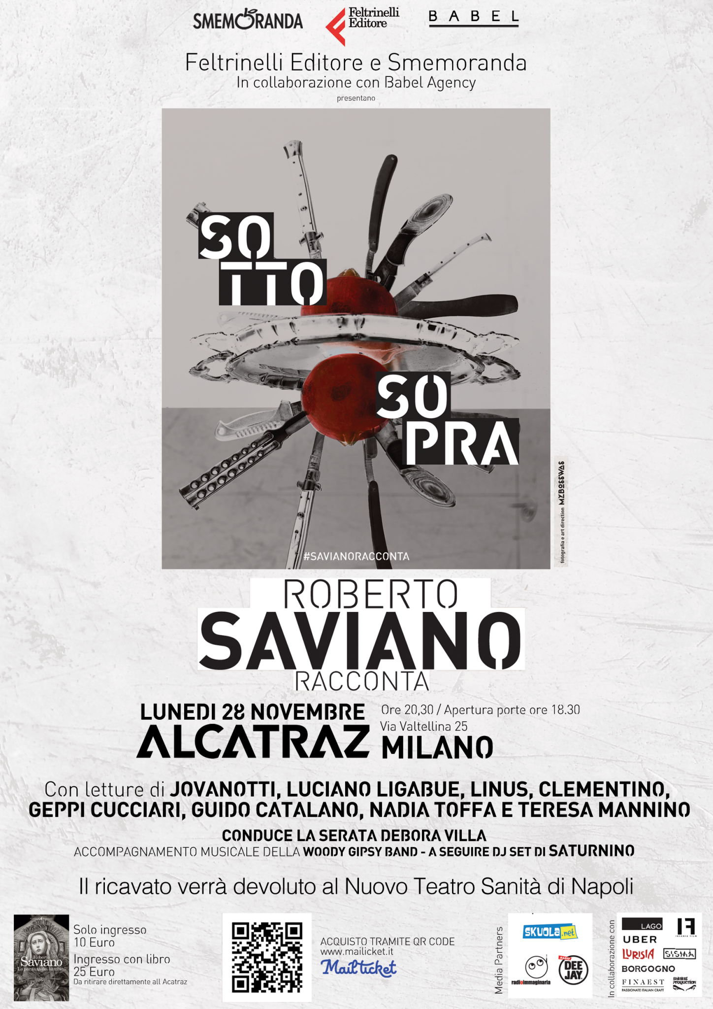 All’invito dell’autore di Gomorra, da anni costretto a vivere sotto scorta, hanno risposto Jovanotti, Luciano Ligabue, Linus, Clementino, Geppi Cucciari, Guido Catalano, Teresa Mannino, Nadia Toffa, Saturnino e Debora Villa, che accompagneranno Saviano in una serata i cui ricavati dai biglietti saranno devoluti al Nuovo Teatro Sanità di Napoli.