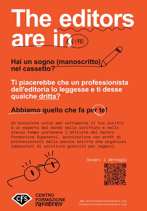 Torna l’iniziativa “The editors are IN” (le iscrizioni sono aperte per aspiranti autrici e autori, che hanno la possibilità di incontrare per un’ora editor professionisti): il ricavato dell’iniziativa sosterrà i laboratori di scrittura che il Centro Formazione Supereroi offre gratuitamente alle scuole pubbliche di Milano – I particolari