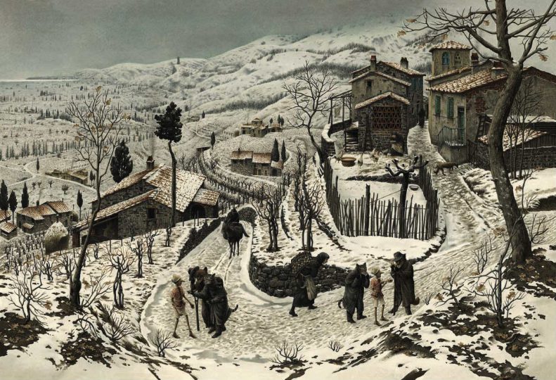 Tuttavia, sfogliando i libri creati dal pennino di Innocenti, emerge subito come la definizione di ‘contemporaneo’ non si possa limitare all’aspetto tecnico, ma debba necessariamente coinvolgere la personalità dell’artista in tutta la sua complessità: basta pensare che è stato tra i primi ad affrontare il tema della Shoah in un racconto per immagini destinato a bambini e ragazzi (ma anche adulti in realtà) nel 1985 (Rosa Bianca), oppure a tradurre il tema del non-luogo e del degrado degli spazi abitativi nei visionari Casa del Tempo (2009) e Cappuccetto Rosso (2012). Nel primo viene narrata la storia di una casa di campagna toscana e dei suoi mutamenti da centro e fulcro socio-familiare fino alla sua spersonalizzazione in moderna abitazione di lusso, mentre nel secondo la storia di Cappuccetto Rosso viene ambientata in una grande città degli anni Duemila. È una «scrittura civile», secondo la definizione di Paola Pallottino (P. Pallottino, Nelle figure invece mi ci trovo… La scrittura civile di Roberto Innocenti, 2012),in dialogo con la contemporaneità, e che richiama alla mente le definizioni di Claudio Parmiggiani e Marc Augé, che invitano a distinguere, da due punti di vista diversi eppure complementari, tra ‘estemporaneo’ e ‘contemporaneo’, tra effimero e capacità di rielaborare una storia stratificata in un impegno attuale.