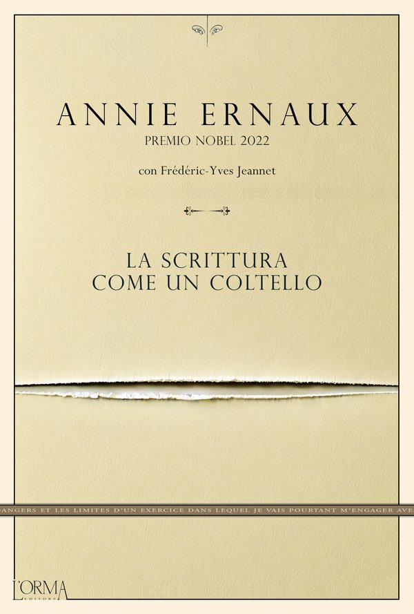 La scrittura come un coltello (L’Orma Editore, traduzione di Lorenzo Flabbi) è descritto come un “esame di coscienza letteraria”. Scritto da Frédéric-Yves Jeannet, autore e professore di Letteratura comparata in Messico, in dialogo con la scrittrice premio Nobel Annie Ernaux, il libro riflette sull’idea di scrittura dell’autrice francese, maturata nel corso di trent’anni di produzione. Il confronto tra Frédéric-Yves Jeannet e Annie Ernaux è avvenuto nel corso di un anno di corrispondenza ed è cresciuto fino a diventare questo libro.
