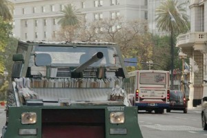 Il “carrarmato” è in realtà una vecchia Ford Falcon verde del 1979, appartenuta ai (purtroppo) celebri “squadroni della morte”, che, prima del colpo di stato del 1976, durante la cosiddetta “Guerra Sporca”, assassinavano sindacalisti, politici di sinistra, operai, religiosi e studenti per alzare il livello di tensione nel Paese.