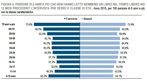 Nel 2015 si stima che il 42% delle persone di 6 anni e più (circa 24 milioni) abbia letto almeno un libro nei 12 mesi precedenti l’intervista per motivi non strettamente scolastici o professionali. Il dato appare stabile rispetto al 2014, dopo la diminuzione iniziata nel 2011.
