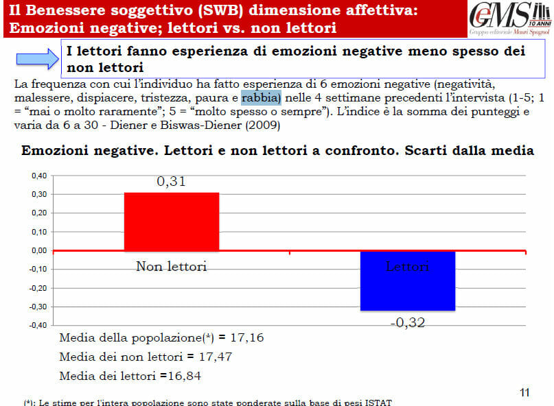 Tra i tanti spunti offerti dallo studio, presentato al pubblico nel corso di Bookcity e affidato al Cesmer, Centro di Studi dell’Università Roma Tre, colpisce (ma non stupisce) il fatto che i lettori del campione (rappresentativo della popolazione italiana) provano emozioni negative meno frequentemente dei non lettori (secondo una dimensione della scala di Diener e Biswas-Diener, che misura la frequenza – da 6 a 30 – di sei emozioni negative – negatività, malessere, dispiacere, tristezza, paura e rabbia – di cui gli individui hanno fatto esperienza recentemente): rispettivamente la media è di 16,84 per i lettori contro il 17,47 dei non lettori (una differenza statisticamente significativa).