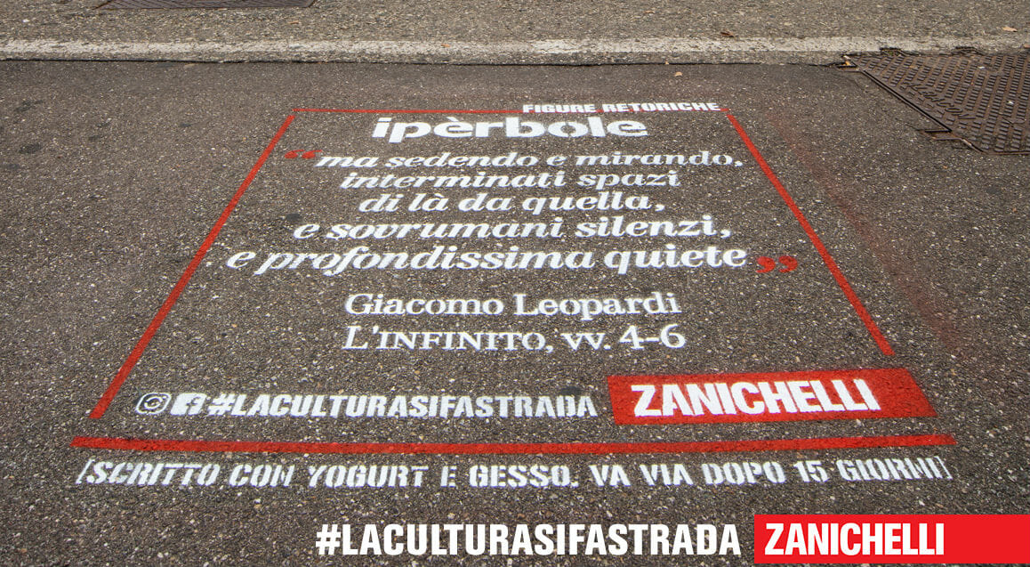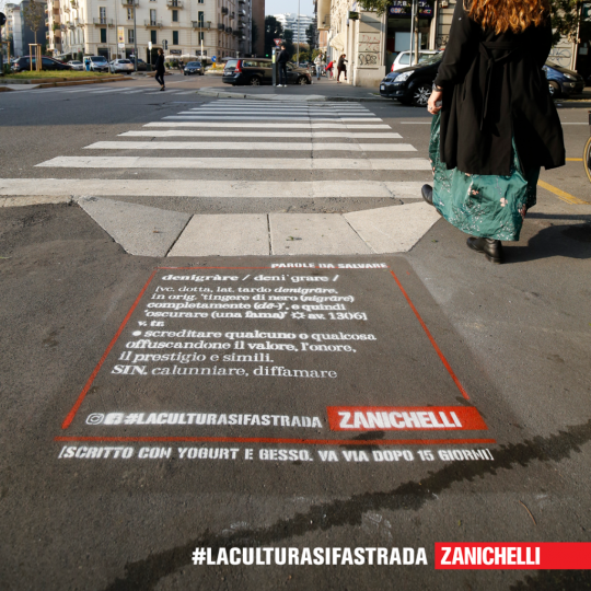 Una campagna di sensibilizzazione di successo, #laculturasifastrada, anche sui social. L’iniziativa, ideata da Zanichelli, è dedicata alle parole da salvare. In cosa consiste? In queste settimane, da Milano a Torino, passando per Padova o Torino, ci si può imbattere nei graffiti urbani legati alla campagna. La tecnica usata è quella dei green graffiti, che utilizza una miscela completamente naturale per realizzare disegni sull’asfalto. Quando la campagna sarà finita, i messaggi verranno cancellati usando soltanto acqua.